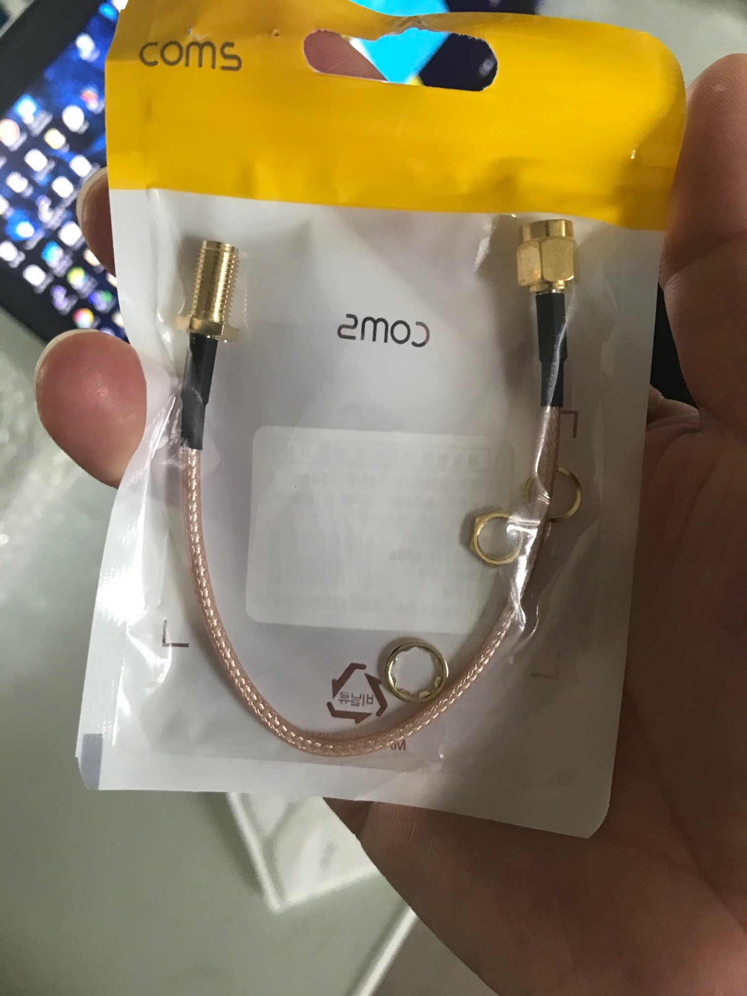 COMS에서 판매하는 SMA 연장 케이블이다. (SMA 케이블을 구매할것). 주의할 점은 내부의 선에 피복 자르기 위해서 선을 당기면 커넥터쪽에서 뽑힌다. 작업하기 전에 커넥터쪽 검정색 부의를 펜치로 세개 눌러서 고정시키고 하자.